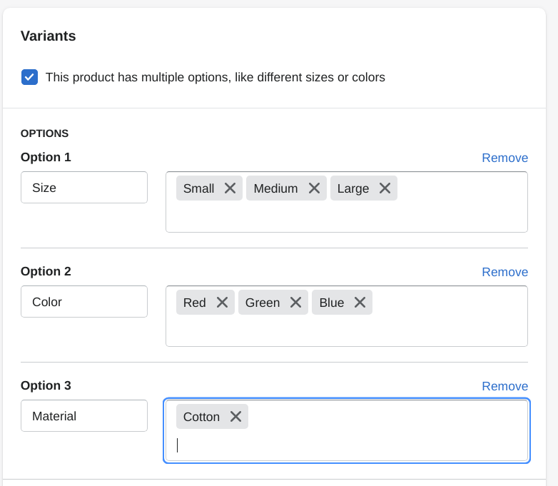 Shopify products allow you to create variants of the product (e.g. Size, Color and Material).